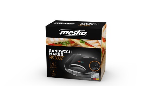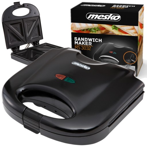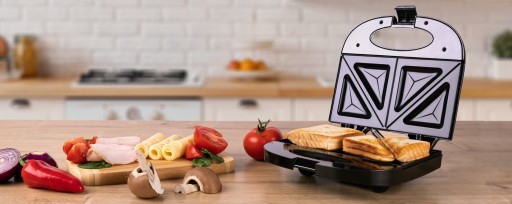 Praktyczny opiekacz do kanapek o mocy maksymalnej 8️⃣5️⃣0️⃣W. Pozwala na jednoczesne przygotowanie 2️⃣ kanapek, które zostaną podzielone na 4️⃣ trójkątne kawałki.