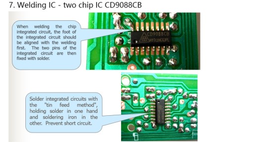 Układy mają nadrukowany schemat montażu na płytce. Trzeba zwrócić uwagę na biegunowość w przypadku takich elementów jak kondensatory, diody, tranzystory. W przypadku diód Led dłuższa nóżka to plus +, większość elementów ma opisane parametry na obudowie. Rezystory mogą mieć oznaczenia paskowe ich oporność oraz tolerancję można odczytać za pomocą kalkulatorów dostępnych w internecie lub mierząc miernikiem. Kolejność montażu zazwyczaj jest dowolna , w zależności od układu, montujemy najpierw najmniejsze elementy.