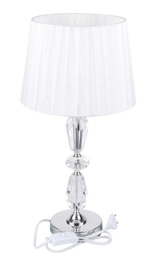 Imponująca pod względem wykonania biała lampa w stylu glamour o niepowtarzalnym wzorze oraz modenj kolorystyce. Unikatowego charakteru nadaje subtelna a'la kryształowa podstwa lampy. Dopełnieniem elegancji jest biały materiałowy kosz. Włączona lampa stwarza przyjemny ciepły klimat.Elegancka i niepowtarzalna dekoracja salonu, sypialni.