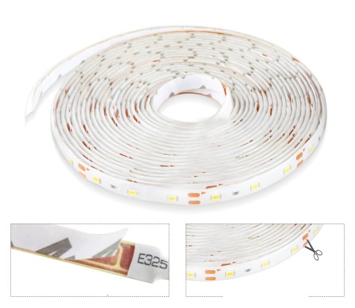 Taśmę i czujnik montuje się za pomocą taśmy dwustronnej którą pokryte są od spodu. Taśmę można skracać co 3 diody czyli ok. 10cm.