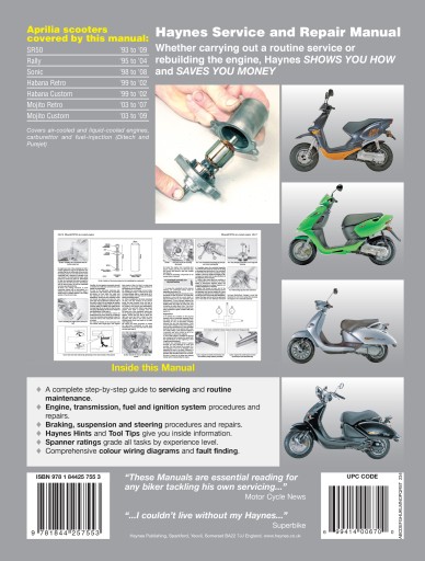 Written from hands-on experience gained from the complete strip-down and rebuild of a Aprilia SR50 H2O New, Haynes can help you understand, care for and repair your Aprilia SR50 H2O New. We do it ourselves to help you do-it-yourself, and whatever your mechanical ability, the practical step-by-step explanations, linked to over 900 photos, will help you get the job done right. Regular servicing and maintenance of your Aprilia SR50 H2O New can help maintain its resale value, save you money, and make it safer to drive.