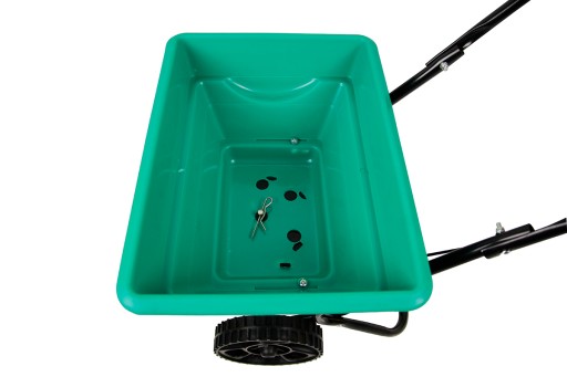 Siewnik do trawy i nawozów posiada płynną regulację za pomocą gałki regulacyjnej i spustową blokadę wysiewu.