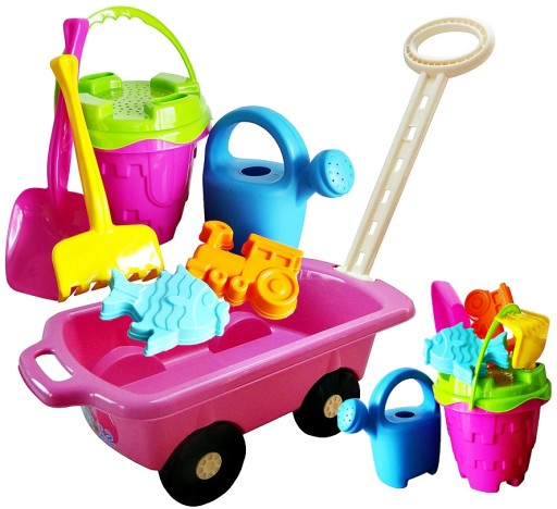 - Wózek z rączką, który znajdzie zastosowanie w zabawach w ogrodzie, piaskownicy, plaży i w domu.