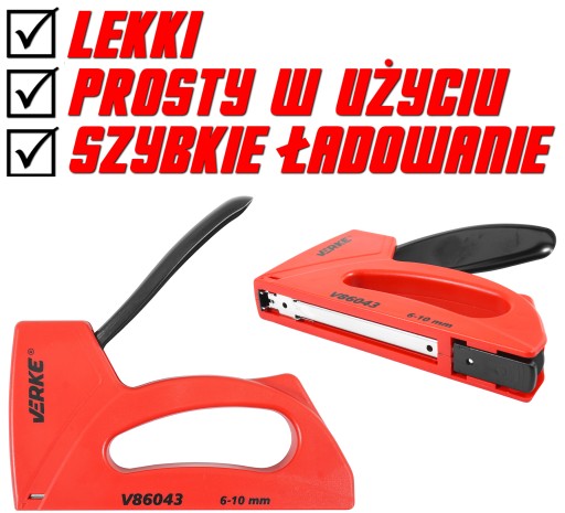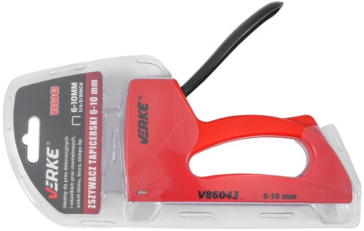 Zszywacz tapicerski marki VERKE. Przeznaczony do szybkiego łączenia różnych materiałów np. drewna z tkaninami, kartonem, papierem lub skórą. Wykorzystywany w pracach tapicerskich, dekarskich, dekoratorskich, wykończeniach budowlanych itp. Łączy materiały za pomocą wbijanej z dużą siłą stalowej zszywki. Zszywacz przeznaczony jest do wbijania typowych stalowych, prostokątnych zszywek w zakresie długości od 6-10mm,