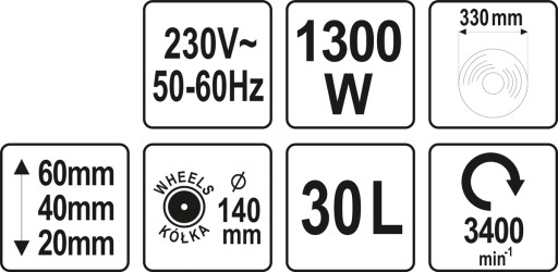 Kosiarka wyposażona jest w trwałe i solidne koła o średnicy 14 cm. Ma moc 1300W i prędkość obrotową na poziomie 3400 obrotów na minutę.