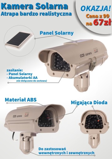 Bardzo wierna kopia oryginalnej kamery z imitacją diód IR i diodą świecącą na czerwono. Jej wykonanie cechuje się wysoką jakością użytych materiałów i dbałością o szczegóły. Całość wygląda bardzo realistycznie, nawet instalator kamer z wieloletnim doświadczeniem nie jest w stanie odróżnić czy to prawdziwa kamera czy atrapa. Dzięki panelowi solarnemu nie musisz się martwić o akumualtorki, ponieważ będą ładowane codziennie przez panel.