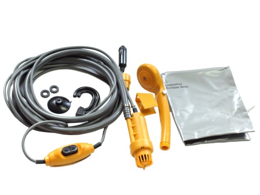 Przenośny prysznic zasilany z gniazdka zapalniczki 12 V. Niezbędny na kempingach, biwakach, wyprawach czy nawet na działce. Wszędzie tam, gdzie nie ma dostępu do łazienki. Prosty w montażu i łatwy w użytkowaniu. Można go powiesić lub zamocować przyssawką. W komplecie pokrowiec.