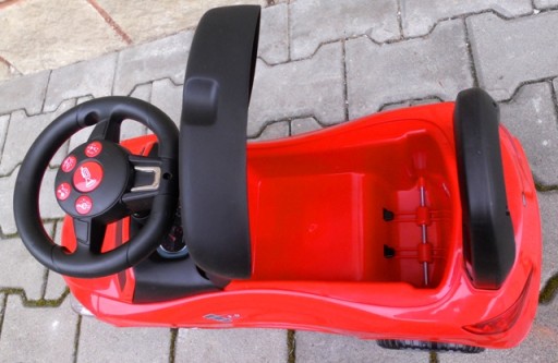 Jeździkiem dziecko kieruje samodzielnie, siedząc za kierownicą i odpychając się nóżkami.