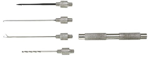 Kompletny i kompaktowy zestaw aluminiowej rączki i końcówek wyposażonych w różne igły oraz wiertło do uzbrajania przyponów karpiowych w przynęty.