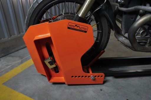 Blokada przeznaczona do zabezpieczenia przed kradzieżą motocykla w halach garażowych, parkingach zewnętrznych i garażach.