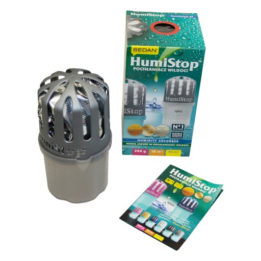 Pochłaniacz wilgoci HumiStop to wysokiej jakości urządzenie, które doskonale radzi sobie z nadmiarem wilgoci w pomieszczeniach. Samodzielnie kontroluje i reguluje optymalny poziom wilgoci, dzięki czemu nie musisz obawiać się o przesuszenie powietrza. Zapobiega skraplaniu się wody, powstawaniu pleśni, korozji, a także eliminuje zapach stęchlizny. Ale to nie wszystko. Pochłania też z otoczenia rozmaite zanieczyszczenia, takie jak kurz, tłuszcz kuchenny czy dym nikotynowy. Pochłaniacz wilgoci HumiStop skutecznie działa na powierzchni do 18 m 2 przez 1-3 miesiące. Czas ten uzależniony jest od poziomu wilgotności w pomieszczeniu i częstotliwości jej występowania. HumiStop to proste urządzenie, pracujące bez użycia prądu, którego działanie można odczuć już po kilku dniach stosowania. Warto dodać, że pochłaniacz HumiStop nie wydziela zapachów i szkodliwych substancji, dlatego bez obaw można go stosować w miejscach, w których przebywają ludzie i zwierzęta. Pochłaniacz wilgoci to niezastąpione urządzenie, sprawdzające się w domu, garażu, piwnicy, łodzi, kamperze – słowem wszędzie tam, gdzie występuje nadmiar wilgoci.