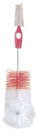 Specjalnie zaprojektowana szczotka do bezpiecznego, nierysującego czyszczenia łącząca dwie funkcje: większa szczotka do czyszczenia butelek, mniejsza do mycia smoczków przed ich dezynfekcją termiczną.