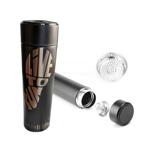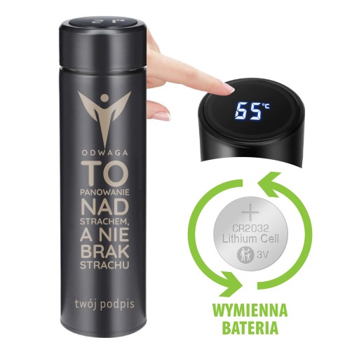 Posiada wbudowany w nakrętkę termometr z wymienna baterią CR2032, który przy dotknięciu wyświetlacza pokazuje temperaturę napoju .