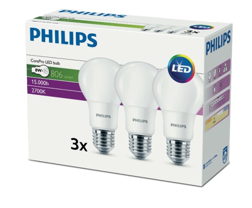 Лампа A+ PHILIPS CorePro LED 8Вт (60Вт) 2700К 3шт.