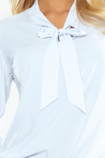 Śliczna elegancka bluzka w kolorze białym. Efektowne wiązanie z przodu.Wkładana przez głowę.Wykonana z przyjemnego materiału. Klasyczny ponadczasowy krój.