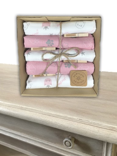 Komplet 5 sztuk najwyższej jakości pieluszek jest efektownie opakowany, gotowy do wręczenia jako prezent. W zestawie znajduje się również gratis w postaci firmowych klamerek.