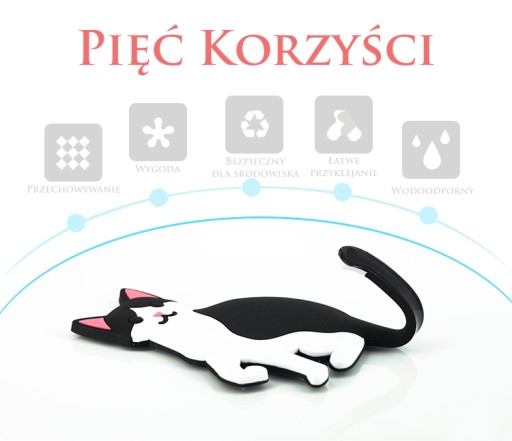 Kotek jest ŁATWY W UŻYCIU - Łatwa technologia przyklejania, która nie pozostawia zabrudzeń oraz uszkodzeń ścian / powierzchni, jest łatwy do usunięcia. Nie ma potrzeby wbijania gwoździ i wiercenia. Szeroko stosowany na różnych gładkich powierzchniach, takich jak drewno, płytki, ceramika, metal i plastik.