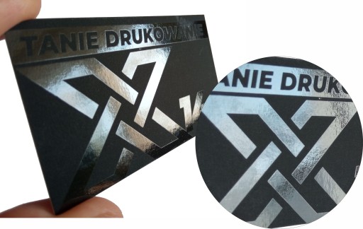 Na powyższych zdjęciach lakierem wybiórczym jest pokryty logotyp oraz tekst "TANIE DRUKOWANIE", na drugiej powtarzający się wielokrotnie logotyp w tle. Co istotne i ciekawe elementy, które chcemy polakierować nie muszą być w ogóle zadrukowane - czyli tak jak na pierwszej stronie prezentowanej tutaj wizytówki. Nie jest tam użyty nadruk w kolorze a tylko i wyłącznie pokrycie lakierem wybiórczym.