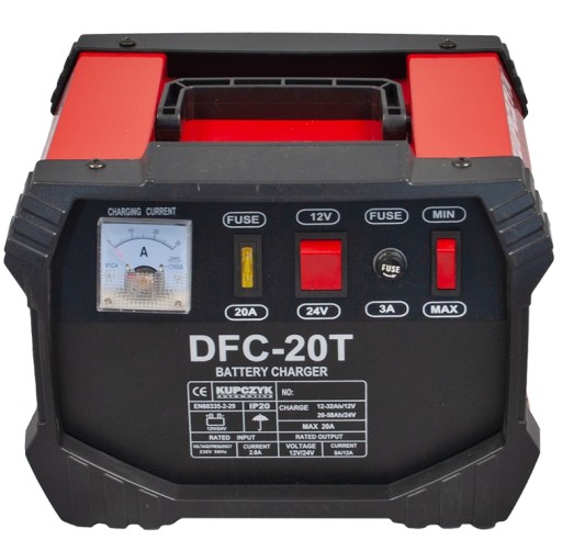 Prostownik do ładowania akumulatorów Kupczyk DFC-20T przeznaczony jest do ładowania akumulatorów kwasowych prądem o natężeniu 12V lub 24V. Urządzenie wyposażone i intuicyjny panel sterowania z praktycznym wychyłowym (analogowym) wyświetlaczem. Na panelu znajdują się wygodne przełączniki: 12V/24V oraz przyciski wolnego i szybkiego ładowania.