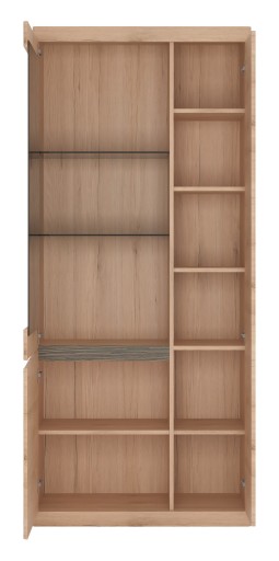 Część półek została umieszczona za szklanym frontem, które dodatkowo mają możliwość zainstalowania oświetlenia natomiast reszta mieści się za drzwiczkami.