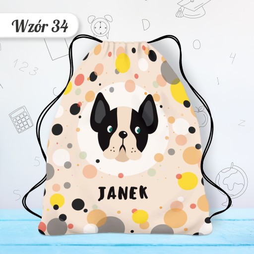 2. W wiadomości do sprzedającego podaj unikatowy wzór worka, znajdujący się nad każdym z projektów oraz imię (lub imię i nazwisko) potrzebne do personalizacji worka.