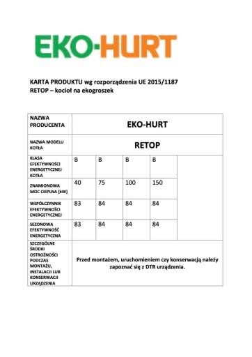 Kocioł grzewczy RETOP przeznaczony jest do podgrzewania wody w układach centralnego ogrzewania temperatury na wyjściu z kotła nie przekraczającej 85°Coraz o max ciśnieniu roboczym nie większym niż 1,5 bara.