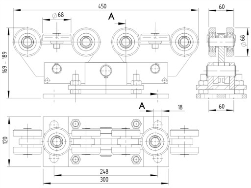 Komplet wózków 10 rolkowych z akcesoriami do szyny 80x80x5 mm - zestaw dedykowany do dużych, ciężkich bram przesuwnych o wadze 1200 kg.