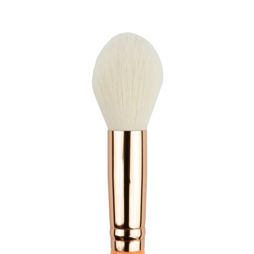 Pędzel sprawdzi się idealnie do konturowania kształtu twarzy. Nadaje się zarówno do bronzera, jak i różu ale również do rozświetlacza. Jego kształt ułatwia nam pracę i dobrze blenduje, co zapobiega powstawaniu plam na twarzy. Pędzel jest miękki, wykonany z włosia syntetycznego w kolorze białym. Rewelacyjny wielofunkcyjny pędzelek z urokliwą skuwką w kolorze różowego złota i pomarańczowym trzonkiem.
