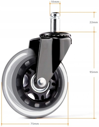 ▶ Kółka zostały zaprojektowane z myślą o jak największej uniwersalności. Dzięki czemu uzyskaliśmy model, który pasuje jednocześnie do foteli biurowych, obrotowych, gamingowych, hokerów, mebli itp.