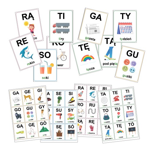 Pomoc składa się z 19 zalaminowanych plansz w formacie A4. Na każdej planszy znajduje się 9 kart, na których jest sylaba, przykład wyrazu z pogrubioną na zieloną sylabą oraz pasujący do niego obrazek – łącznie 171 kart obrazkowych. Plansze można samodzielnie pociąć na mniejsze karty, jak na przedstawionych zdjęciach. Rozmiar kart po wycięciu to 6,5×9,5 cm.