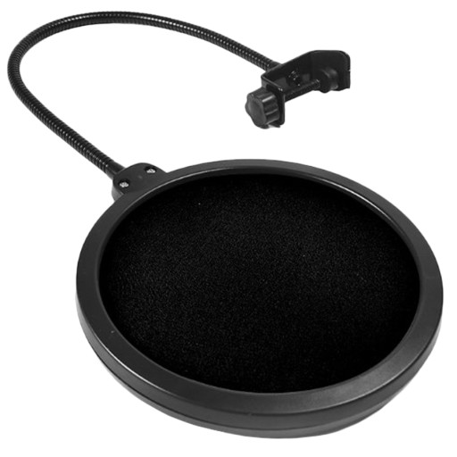 Filtr mikrofonowy charakteryzuje podwójna warstwa rozpraszająca oraz śruba zaciskowa z długim ramieniem do mocowania do podstawy mikrofonu, chroniąc mikrofon przed śliną.