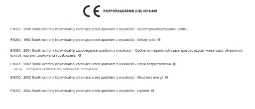 - Linka amortyzująca: (Pas z poliestru, lina z poliamidu)