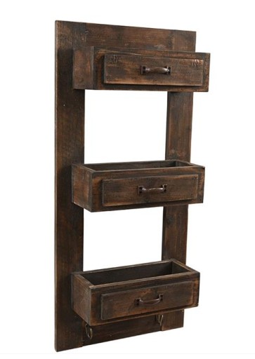 Wieszak ozdobny wykonany z drewna w kolorze ciemnego brązu. Posiada trzy półeczki w formie małych skrzyneczek zdobionych na zewnątrz ozdobnymi uchwytami oraz u dołu dwa haczyki. Rustykalny charakter wieszaka będzie idealnym uzupełnieniem zarówno wnętrz nowoczesnych jak i klasycznych.