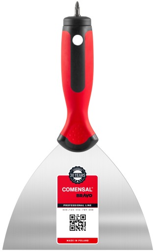Klasyczna szpachelka ze stali nierdzewnej o szerokim ostrzu z WKRĘTAKIEM krzyżakowym z profesjonalnej linii COMENSAL BRAVO – narzędzie niezbędne podczas większości małych i dużych prac remontowych, malarskich i budowlanych.