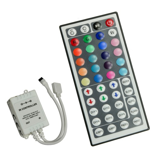Kontroler IR RGB 44 przyciski 6A, służy do sterowania taśmą led RGB lub żarówkami led RGB 12V DC. Napięcie zasilania - 12V DC. Sterowanie - IR (podczerwień). Natężenie - do 6A. Moc - do 72W