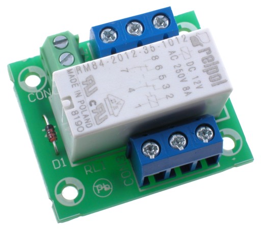 Moduł wykonawczy zrealizowany na przekaźniku dużej mocy, umożliwiający sterowanie urządzeniami elektrycznymi zasilanymi zarówno prądem stałym jak i przemiennym.