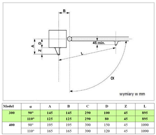 2. Aby uzyskać otwarcie skrzydła pod kątem większym niż 90°: A+B<C.