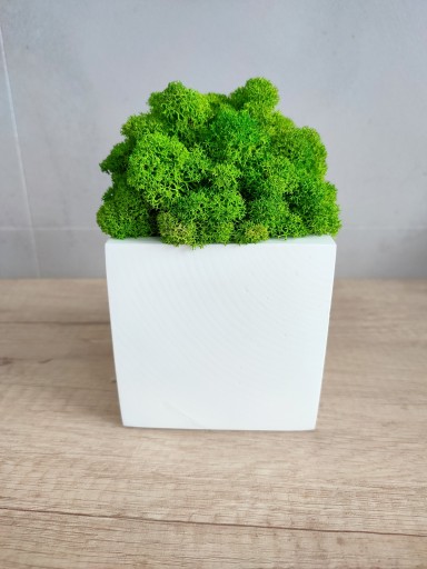 Ręcznie wykonana mini doniczka z drewna sosnowego wypełniona mchem chrobotkiem w kolorze jasnej zieleni. Sprawdzi się jako dekoracja w każdym pomieszczeniu. Najpiękniej zaprezentuje się jako zestaw trzech doniczek lub z wersją prostokątną, dostępna na innej naszej aukcji.
