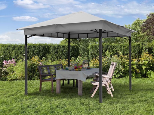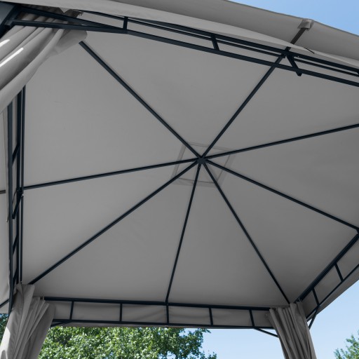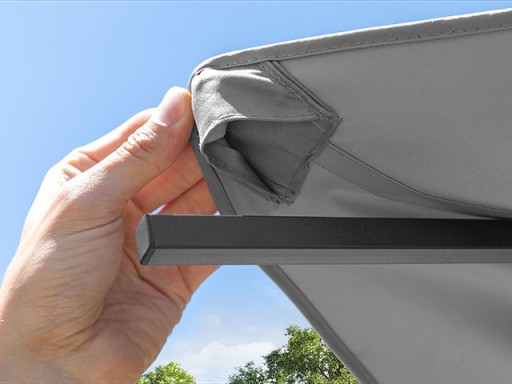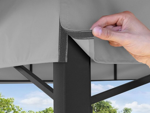 W dostawie znajdują się również cztery ściany boczne, dzięki którym w razie potrzeby można chronić swój taras przed wzrokiem sąsiadów lub zastosować je jako dodatkową ochronę przed wiatrem i deszczem. Można je także szybko i łatwo zamocować do drążka karnisza lub w razie potrzeby połączyć ze sobą za pomocą zamków błyskawicznych. Pawilon możemy dowolnie zamykać lub otwierać w zależności od naszych potrzeb.