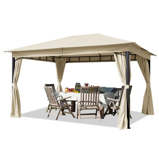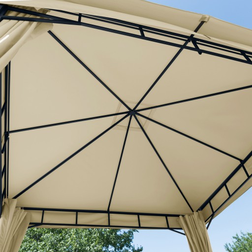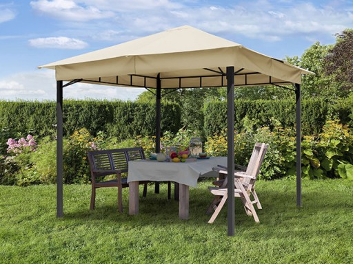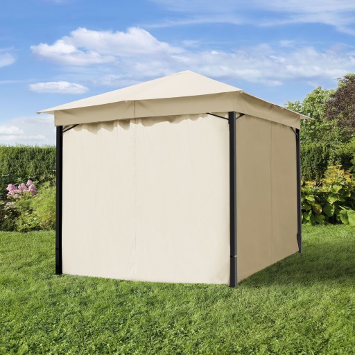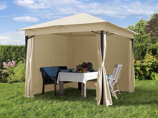 W dostawie znajdują się również cztery ściany boczne, dzięki którym w razie potrzeby można chronić swój taras przed wzrokiem sąsiadów lub zastosować je jako dodatkową ochronę przed wiatrem i deszczem. Można je także szybko i łatwo zamocować do drążka karnisza lub w razie potrzeby połączyć ze sobą za pomocą zamków błyskawicznych. Pawilon możemy dowolnie zamykać lub otwierać w zależności od naszych potrzeb.