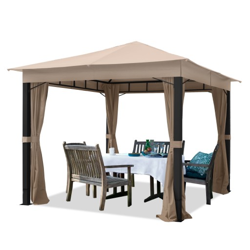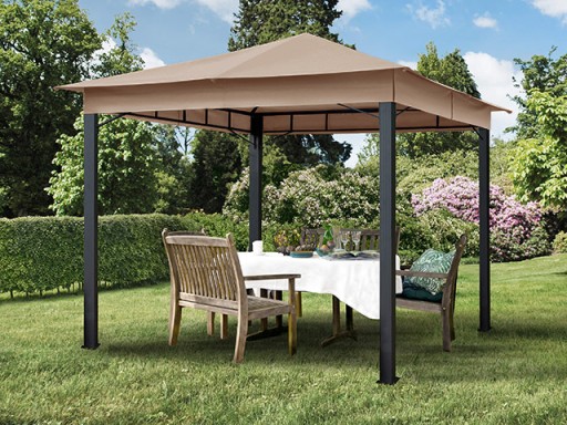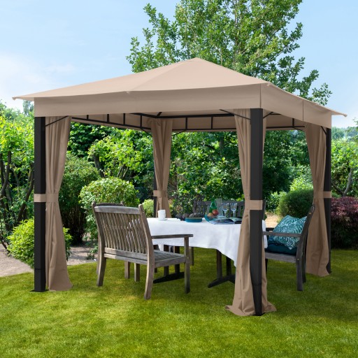 Malowana proszkowo konstrukcja aluminiowo-stalowa, wysokiej jakości dach z poliestru o gramaturze ok. 220 g/m² oraz indywidualne wzornictwo sprawiają, że ten pawilon jest czymś więcej niż tylko zbiorem poszczególnych części. Nawet montaż jest przekonujący. Dzięki wysokiej jakości systemowi zatrzaskowemu, w pełni wodoodporny pawilon można rozłożyć bez wysiłku w ciągu ok. 30 minut - i to bez użycia narzędzi. Jeśli więc chcesz od czasu do czasu przenieść się w inne miejsce w ogrodzie, model ten można szybko złożyć i rozłożyć, a następnie ustawić w innym miejscu.