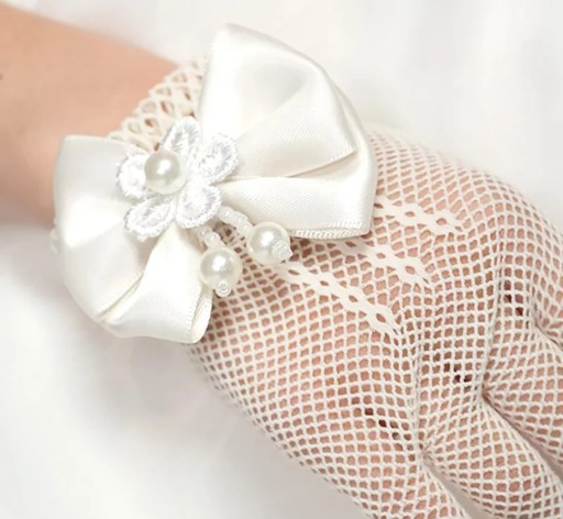 Eleganckie białe rękawiczki ażurowe ozdobione piękną kokardką z ozdobnymi perełkami i kwiatuszkiem. Uszyte z rozciągliwej lycry.