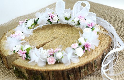 Uroczy kolorowy wianuszek z szyfonowych kwiatów w połączeniu z różowymi ozdobnikami i białymi paczkami piankowymi, tworzy najmodniejszy wianek dla każdej dziewczynki.