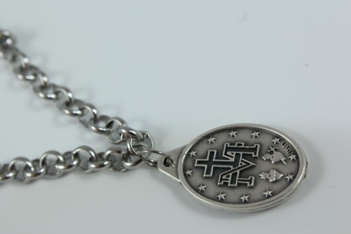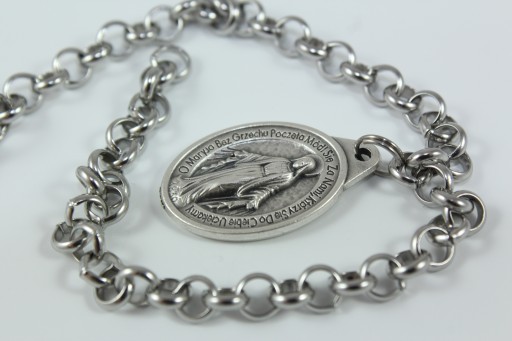 - Medalik dużych rozmiarów produkcji włoskiej ale z napisem po Polsku : "O Maryjo Bez Grzechu Poczęta Módl Się Za Nami, Którzy Się Do Ciebie Uciekamy" , bardzo precyzyjnie i starannie wykonany, z najwyższą dbałością o szczegóły, lekki.
