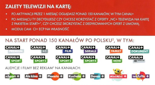 Oferta z usługą „nc+ telewizja na kartę z Pakietem Start+” z modułem CAM CI+ ECP. Dostęp do ponad 150 kanałów, w tym ponad 90 w jakości HD na zasadach pre-paid, bez konieczności podpisywania umowy.