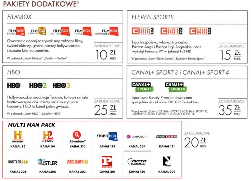 - Zostawić tylko Pakiet Start+ z dostępem do ponad 90 kanałów, w tym połowa w jakości HD, na zasadach pre-paid, bez umowy abonamentowej w cenie od 20,75 zł miesięcznie. Minimalny okres na jaki można wykupić pakiet na kartę w opcji pre-paid to jeden miesiąc za 34,00zł.