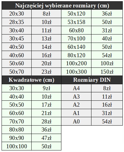 W tabeli przedstawiamy pozostałe wymiary odbitek jakie możemy drukować wraz z ich cenami.