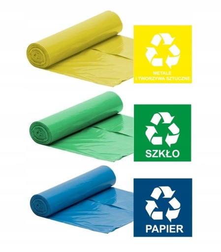 - Kolor: Niebieski - PAPIER, Zielony - SZKŁO, Żółty - PLASTIK;