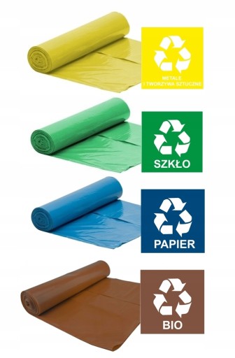 - Kolor: Brązowy - BIO, Niebieski - PAPIER, Zielony - SZKŁO, Żółty - PLASTIK;