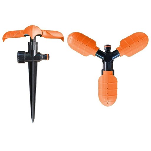 Zraszacz obrotowy 3-ramienny. Wykonany z tworzywa sztucznego na przelotowym plastikowym kolcu. Każde regulowane ramię posiada pięć otworków zraszających. Kolec posiada uniwersalny nypel. Obszar zraszania 15 m.